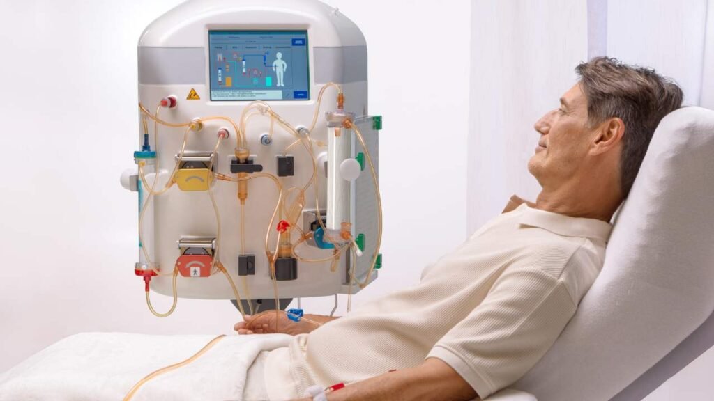 After filtration, the purified blood is safely returned to the patient’s body through the intravenous line. The system continuously circulates blood during the treatment session.